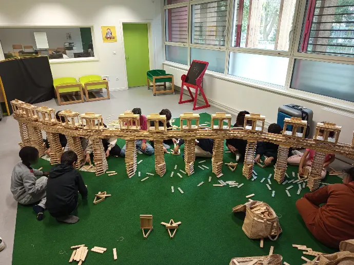 Les enfants ont été amenés à construire collectivement un pont de 5 mètres, en débutant par des tours verticales servant de piliers, puis en ajoutant des attaches afin de relier l’ensemble et former une structure continue et solide.