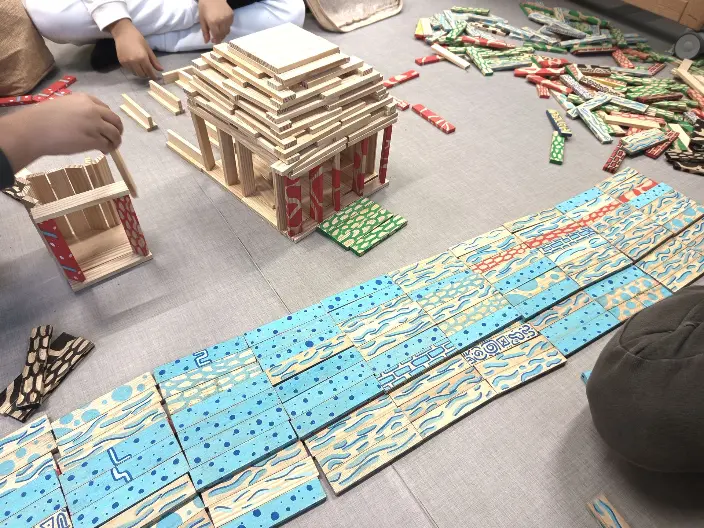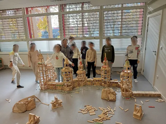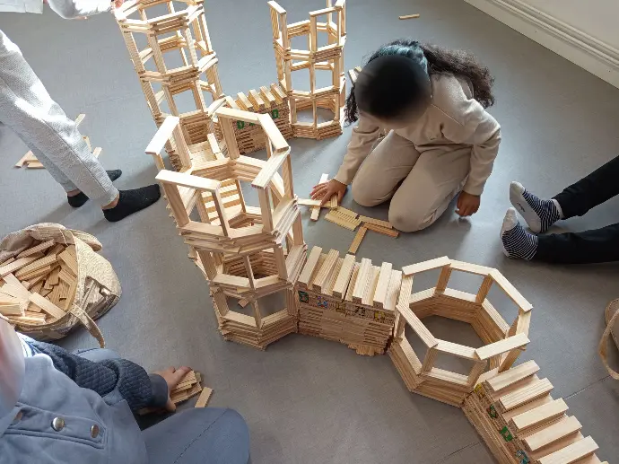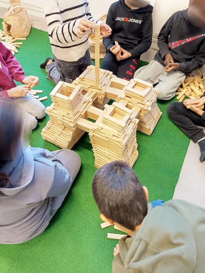 Lors de cet atelier collaboratif, les enfants ont d’abord réalisé individuellement des portions de murs du château. Ces éléments, conçus de manière modulaire, leur ont permis de réfléchir à la taille, à la forme et à l’organisation globale de la construction.