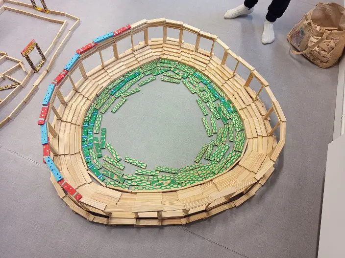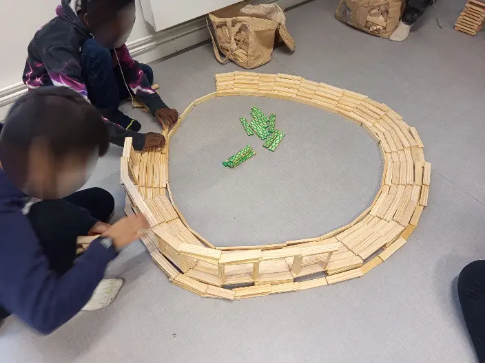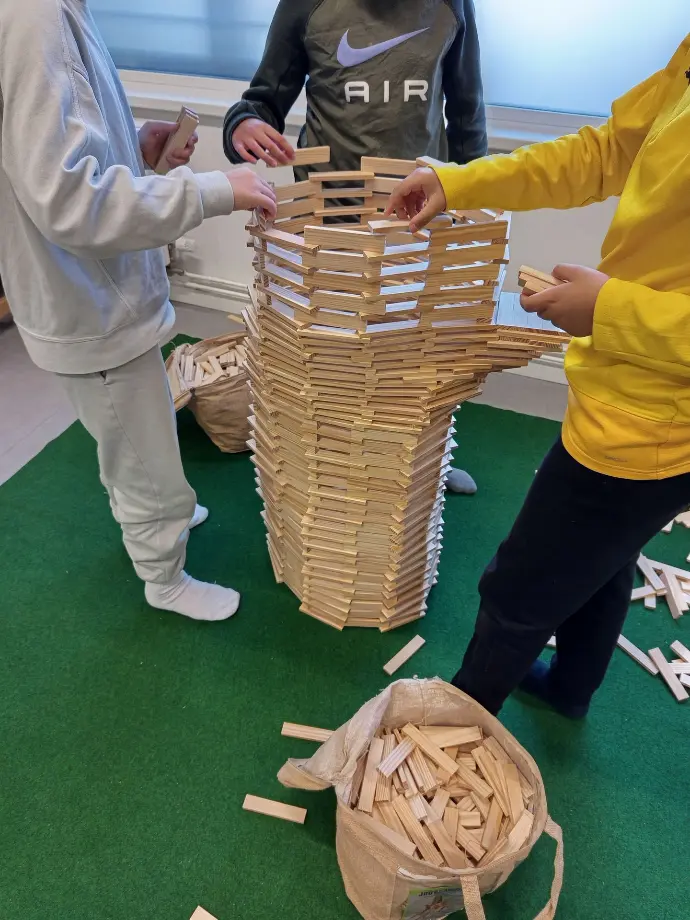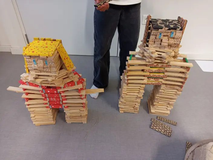 Étape par étape, les groupes ont progressé jusqu’à finaliser leurs constructions. Après environ 1h30 de travail, les enfants ont pu admirer le résultat : une tour Eiffel d’environ 2,20 m de hauteur et une statue de la Liberté d’environ 1,70 m.