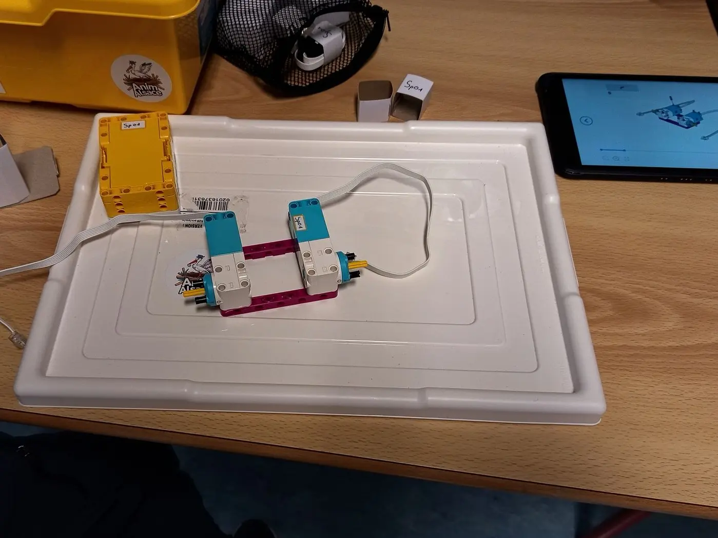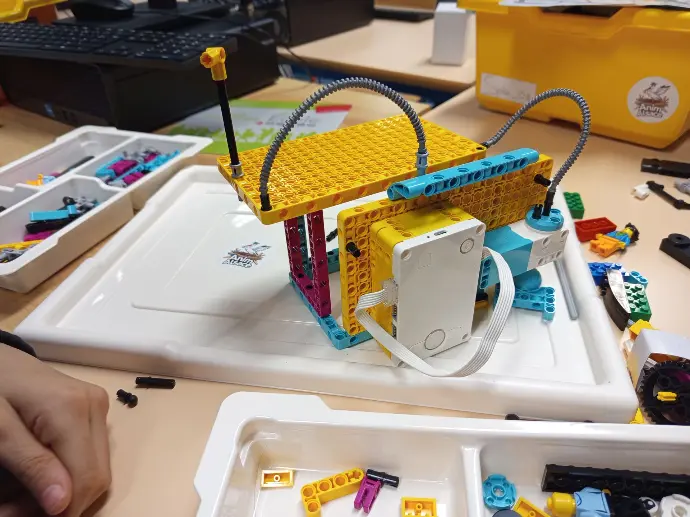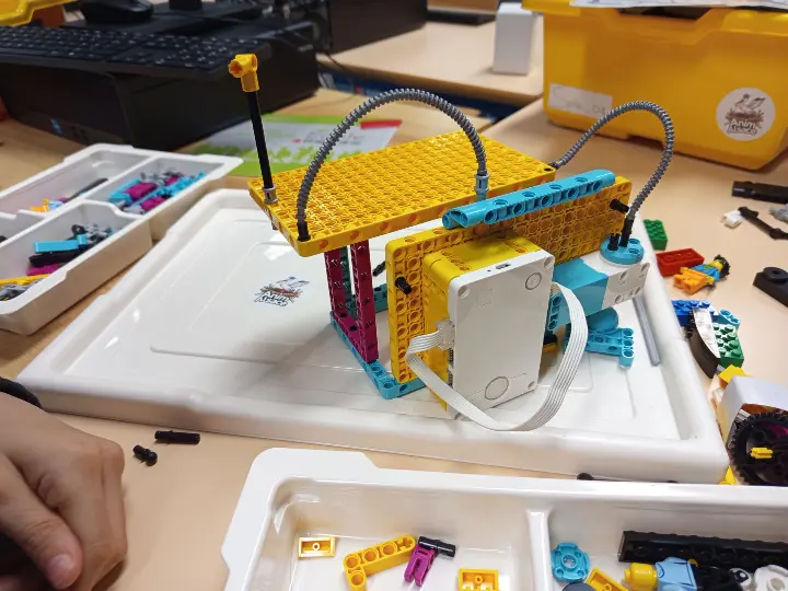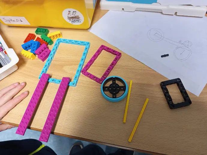 Ils ont ensuite tenté de reproduire leur dessin en construction réelle, en respectant deux contraintes : intégrer au minimum un capteur ou un moteur et utiliser uniquement le matériel disponible dans la boîte. Cet atelier a permis de faire le lien entre idée, représentation et réalisation concrète.